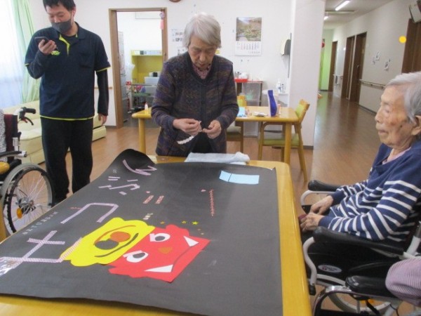 模造紙に鬼を貼り周りに好みのものを貼っていきました( ^ω^)・・・ これでいいのかしら??と不安そうにスタッフに聞いておられました(*^_^*)