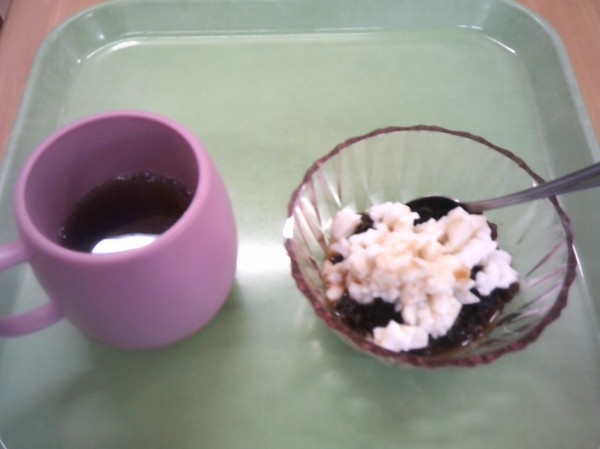 コーヒーゼリーに牛乳ゼリーをのせてました( ^ω^)・・・ これはさっぱりして甘さも控えめで美味しいわ! ペロリと召し上がられておりました(^0_0^)