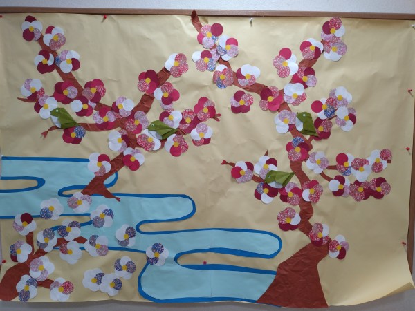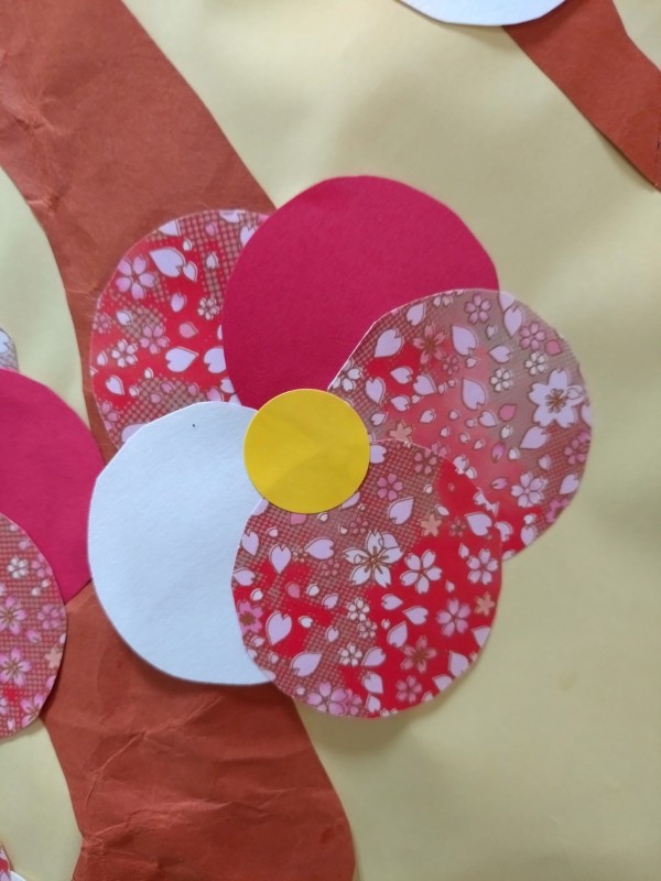 梅の花は柄の入った折り紙を使っているので、色鮮やかですね(^^)/