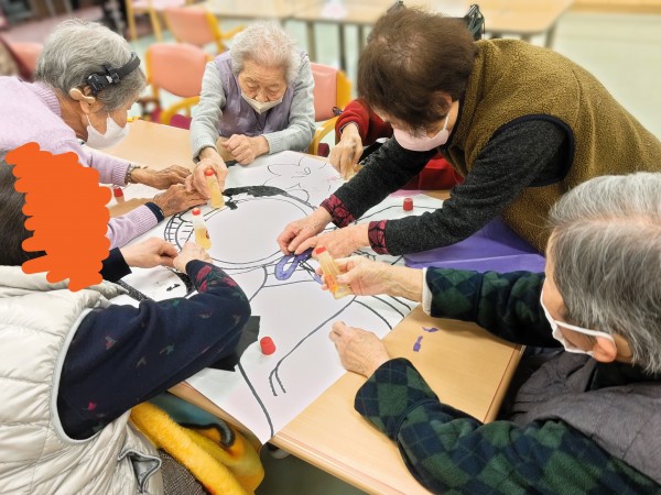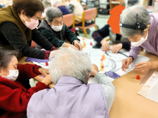 明後日に控える節分の鬼と福のミニ貼り絵と3月の桃の節句に向けた大きな貼り絵の作成をしていただきました!