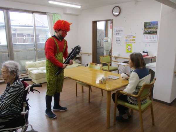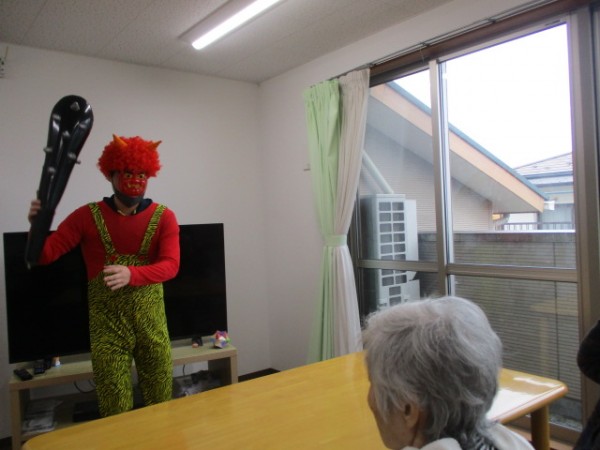 職員が鬼????の衣装を着て鬼は外・福は内と楽しみました。 怖いよ!とシーンと なりました(笑)