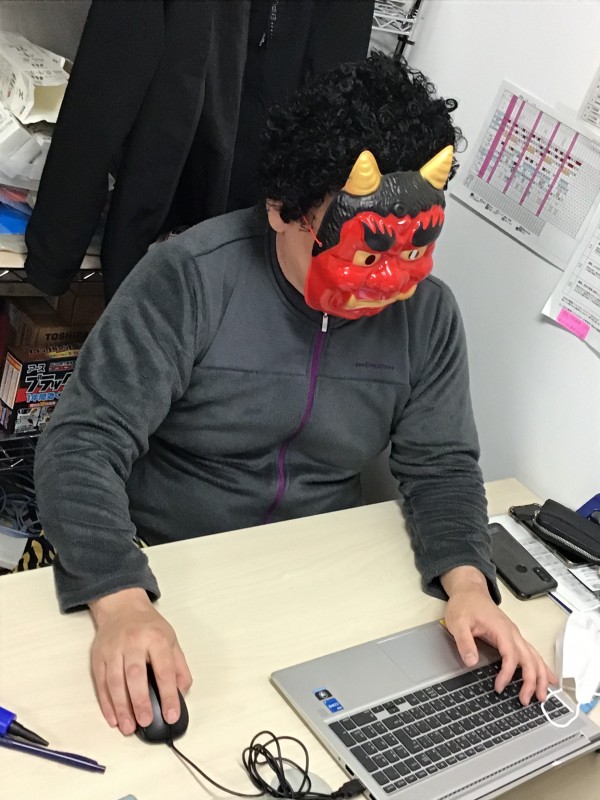 利用者様が運動レクで楽しまれている間、中田南の鬼は事務所で待機です。