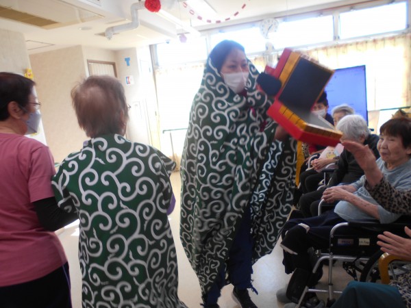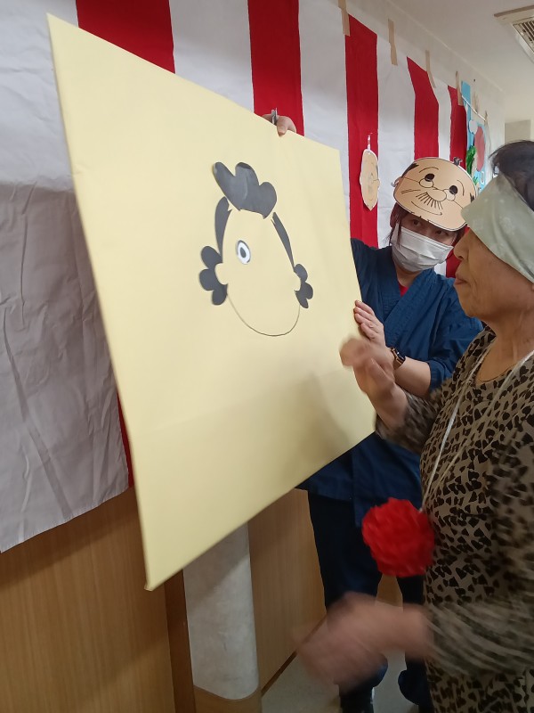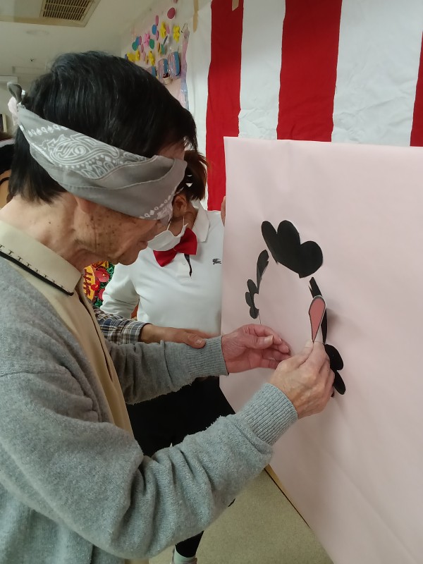 福笑いでは3名の方に前に出て頂きました!「わー、おかしい顔になっちゃった」「なかなか難しいね」と仰り、楽しまれたご様子です(^^)/