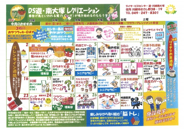 2月に入り、まだまだ寒い日が続きますね。デイサービスでは寒さを吹き飛ばす楽しいレクリエーションを今月もたくさんご用意しています。