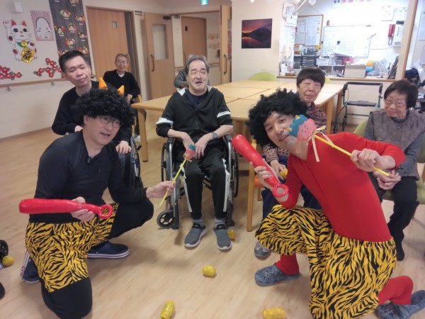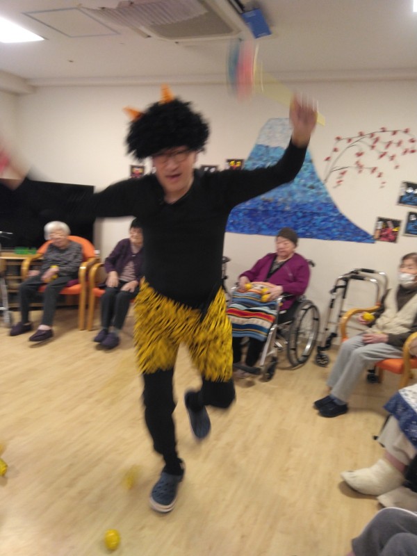 ご入居様が赤鬼・青鬼に豆を投げました。