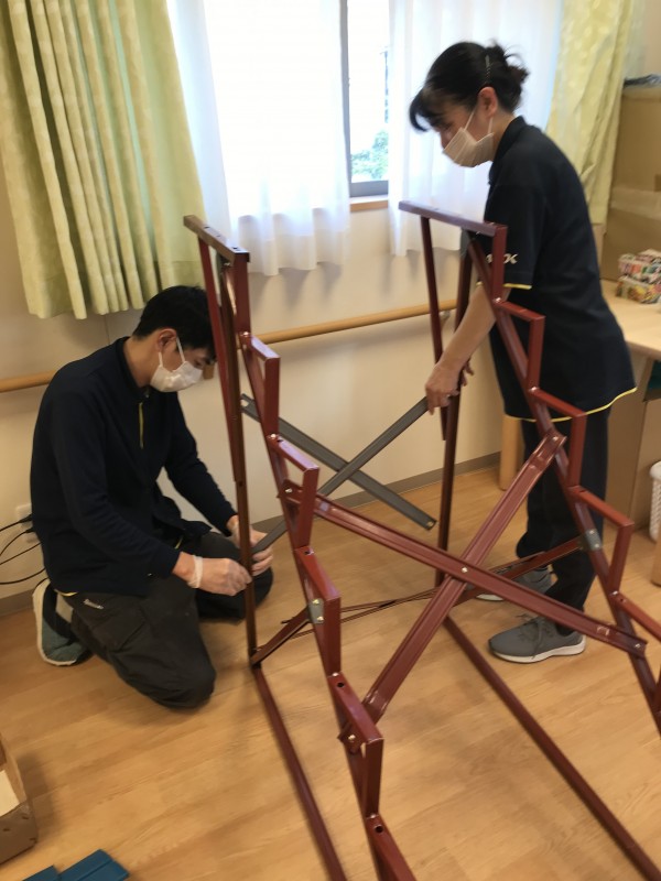 スタッフ2人がかりで骨組みを組み立てていきます。