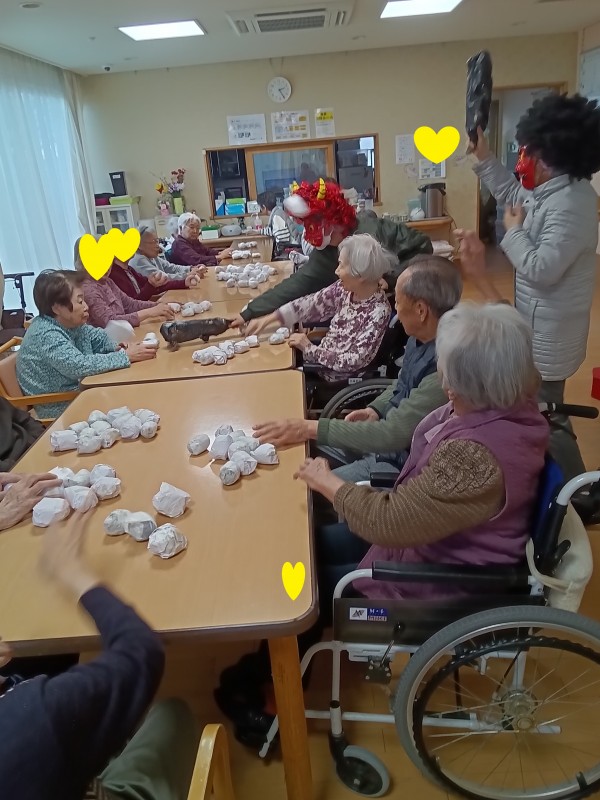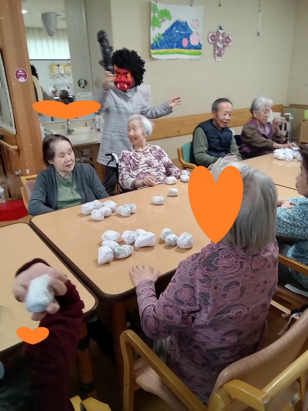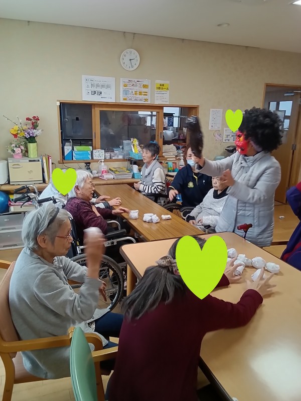 「悪い子はいねえか~‼」「悪い子はいねえか~!!」と鬼がどこからともなく出てくると、初めは皆さん戸惑って固まってしまいましたが、「大変!!やっつけないとやられちゃいますよ!!」という職員の一声で、皆さん一斉に鬼に向かって玉を投げつけました‼