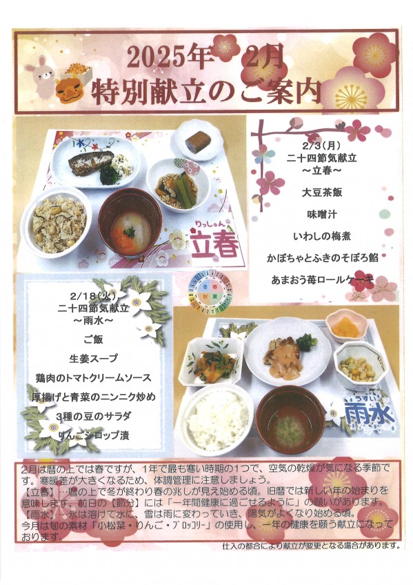 今月は、【立春】【雨水】の特別献立で、みなさんの健康を願います。