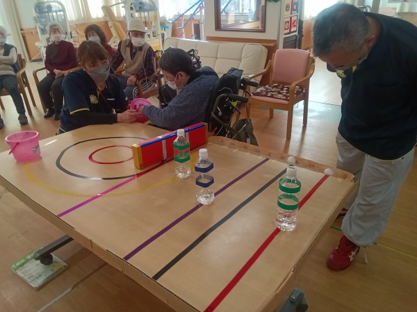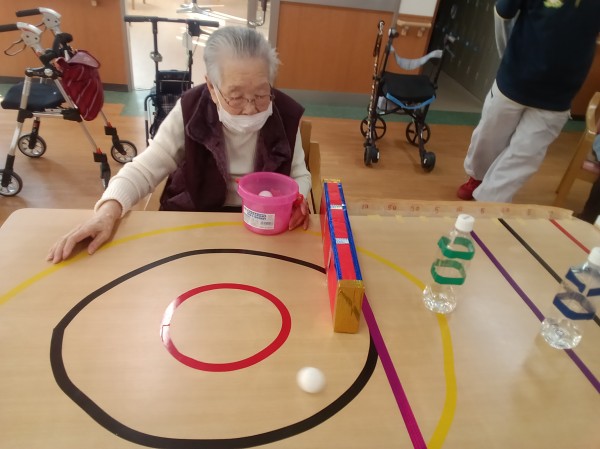 ピンポン玉を転がして、点数のついたカップの中に入れるゲームです。