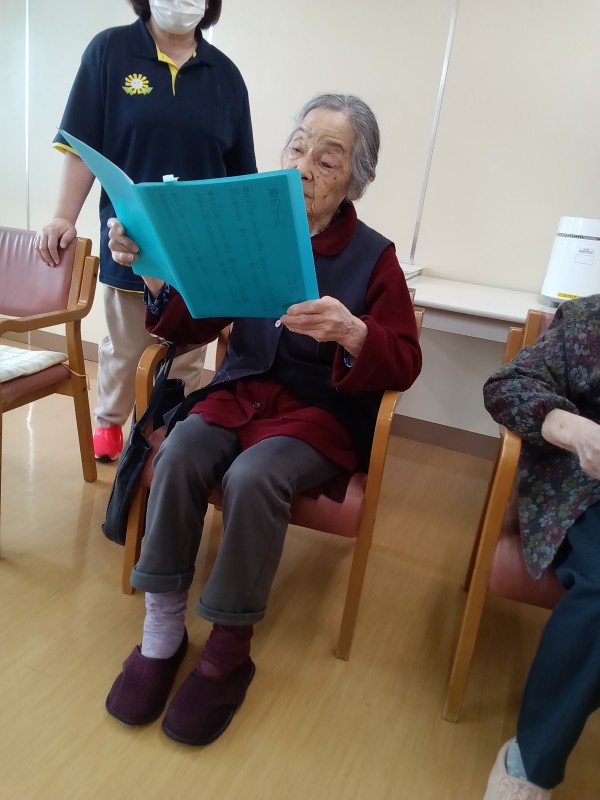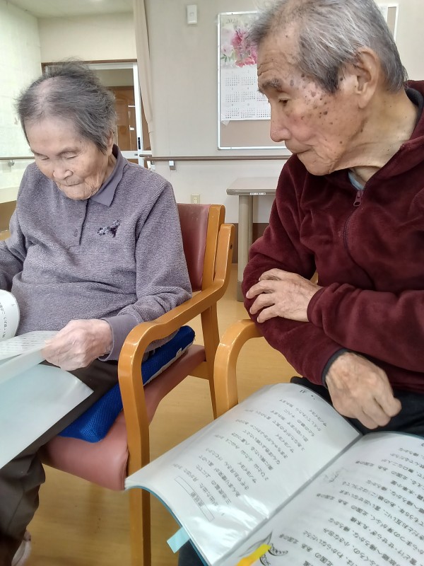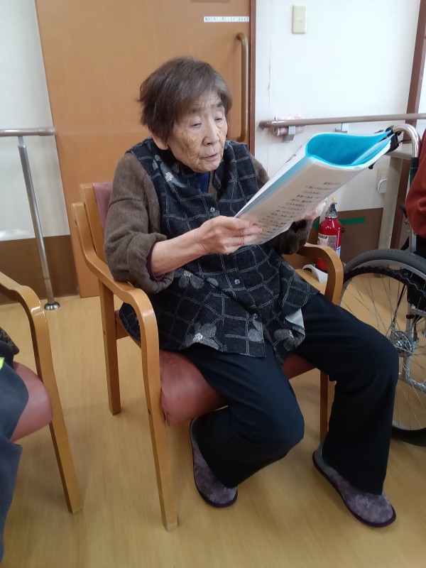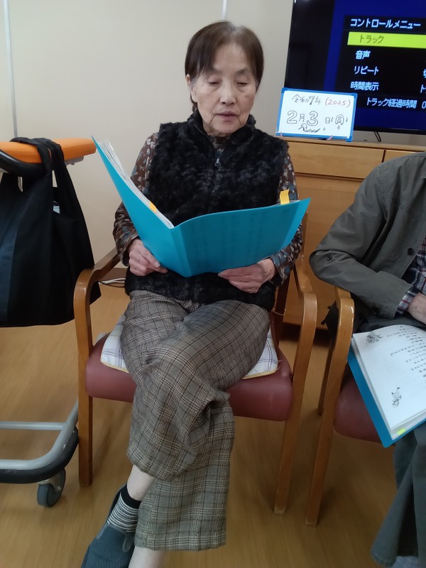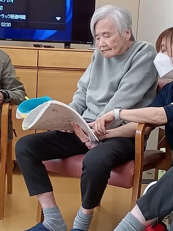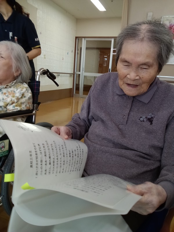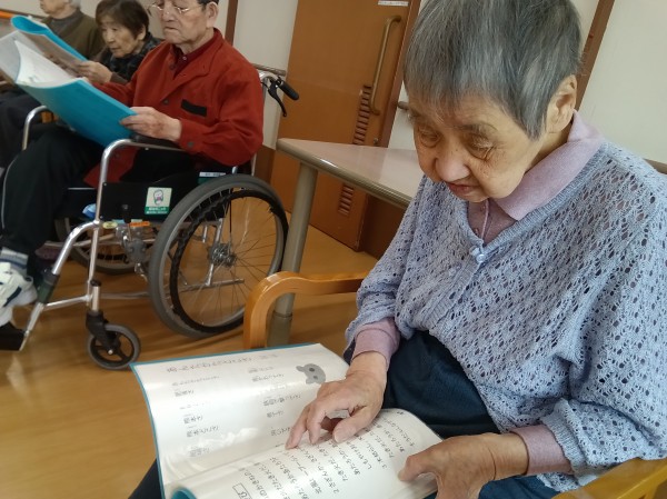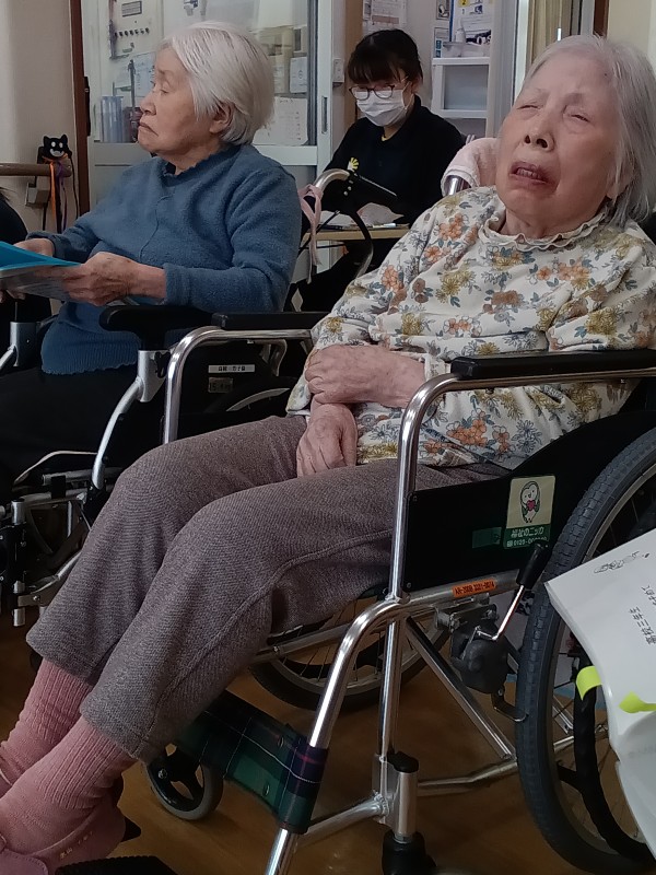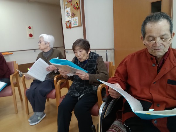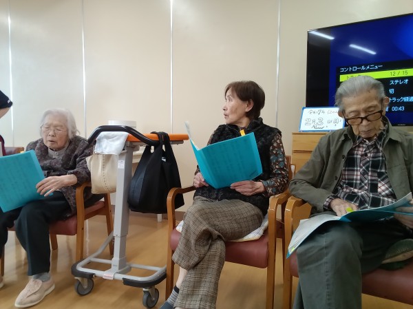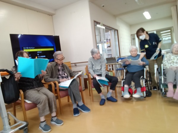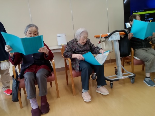 皆さんがフロアに集まって、準備運動も兼ねて歌をうたう様子をご報告します(^^♪