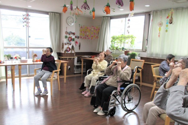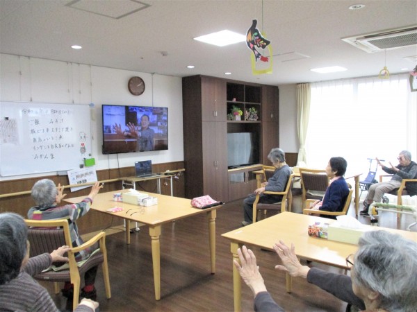 インストラクターと全事業所の入居者様が、リモートで一緒に運動をしています。