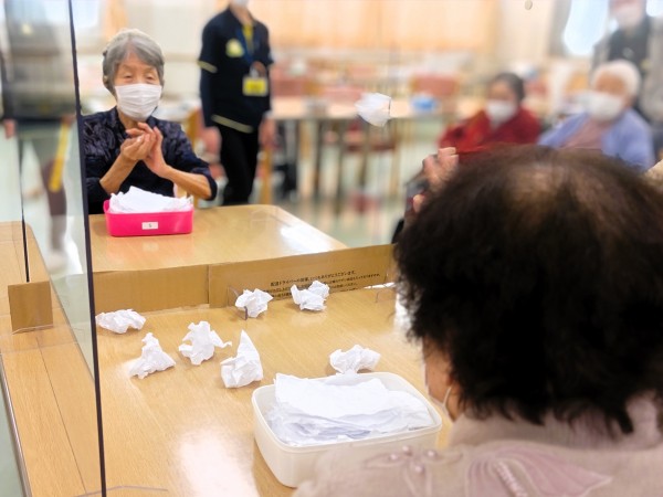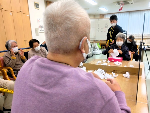 制限時間中箱に入った白い半紙を雪玉の代わりに丸めて相手陣地に投げるだけ!