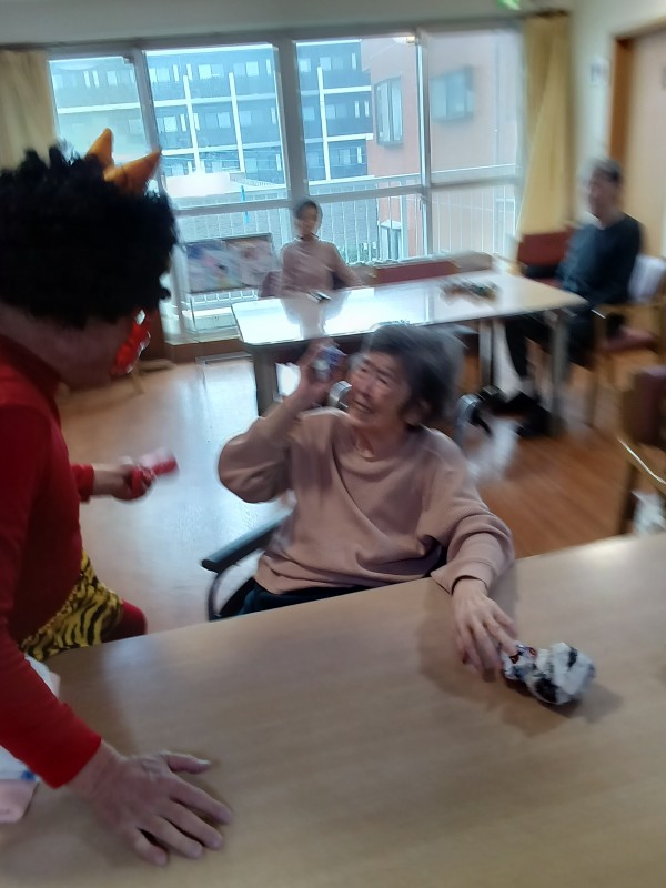 皆様、鬼へ豆(に模した丸めた新聞紙)を思いっきり投げておられました。