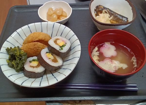 節分祭、昼食は海苔巻き・いなり寿司・イワシの生姜煮・白花豆・すまし汁でした。