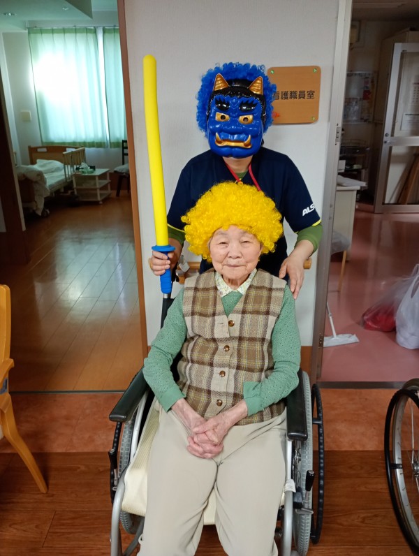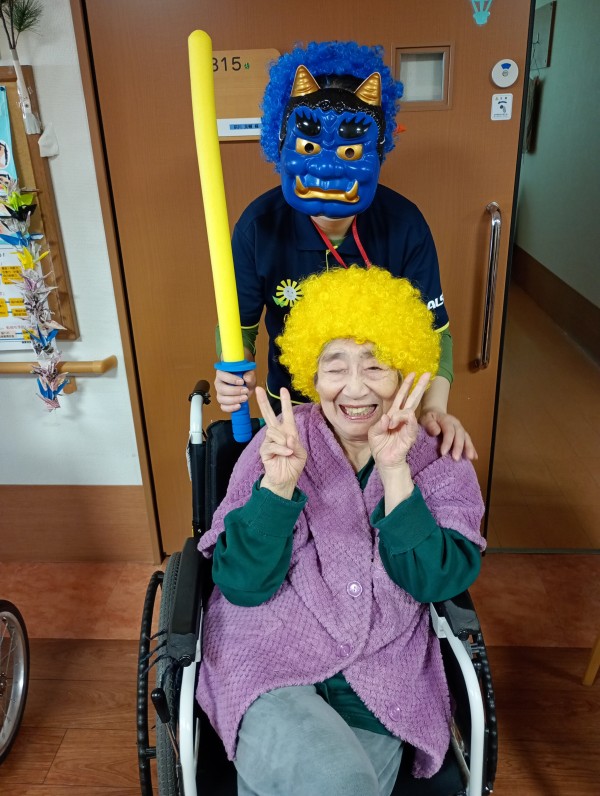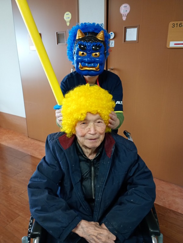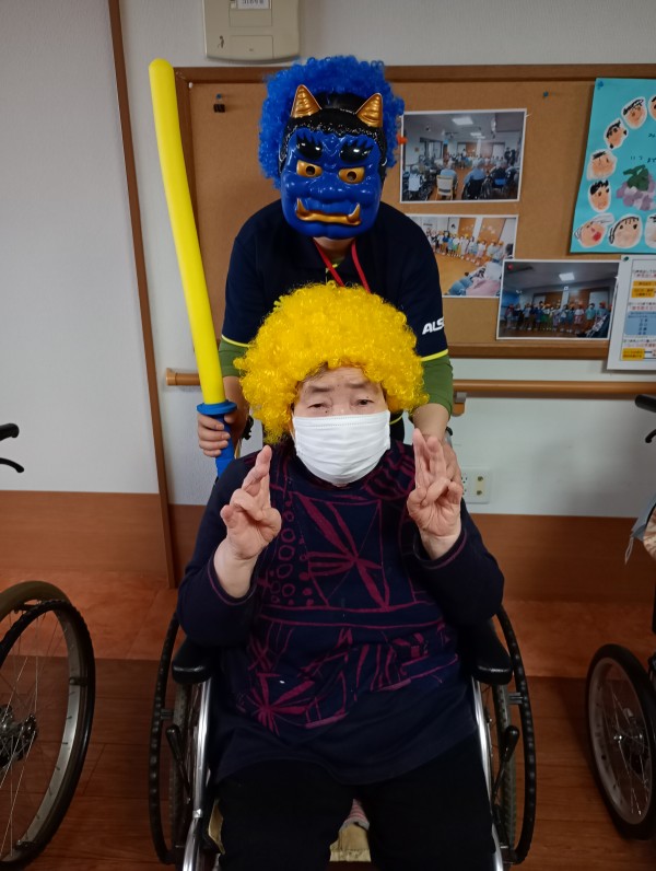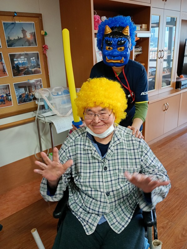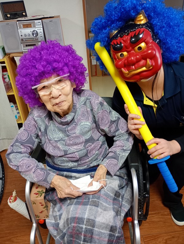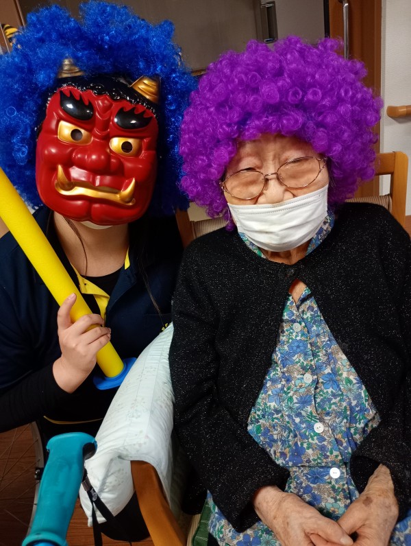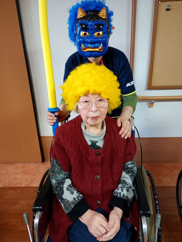 ご利用者様には鬼仕様のかつらをかぶっていただきました。