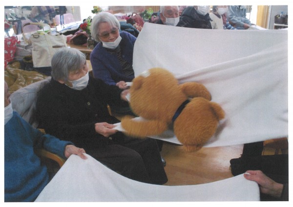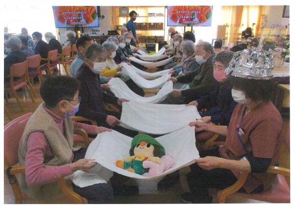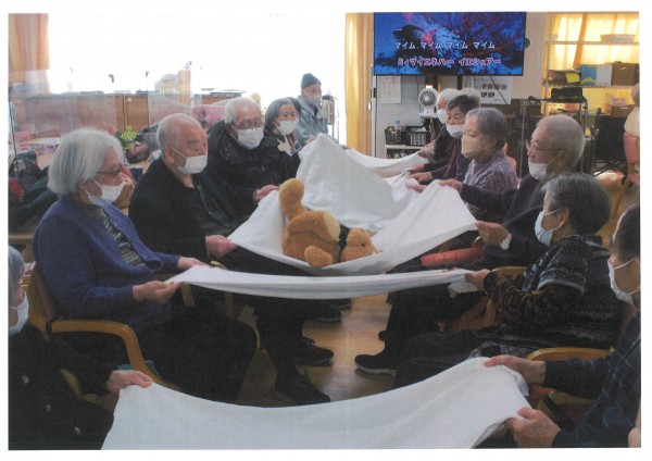 本日午後のレクリエーションは「タオルリレー」タオルを使って、いろんなものをリレーで送るゲームを行いました。