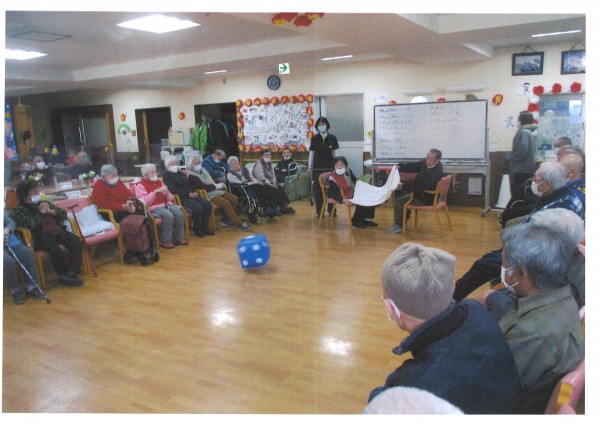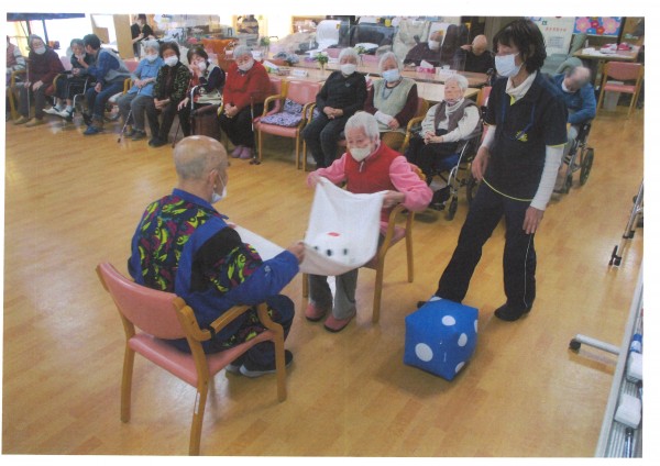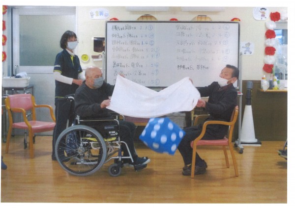 2人1組でバスタオルを持ち、その上にサイコロを乗せ息を合わせてサイコロを投げます。落ちたサイコロの目を足したものが得点になります。出た目の合計を計算するので、ちょっとした脳トレになりますね。高得点を狙うには、力加減が重要。狙って大きい数字を出したいと投げ方を工夫されていらっしゃいました。力を合わせることで、自然と会話も弾み楽しい時間になりました♪