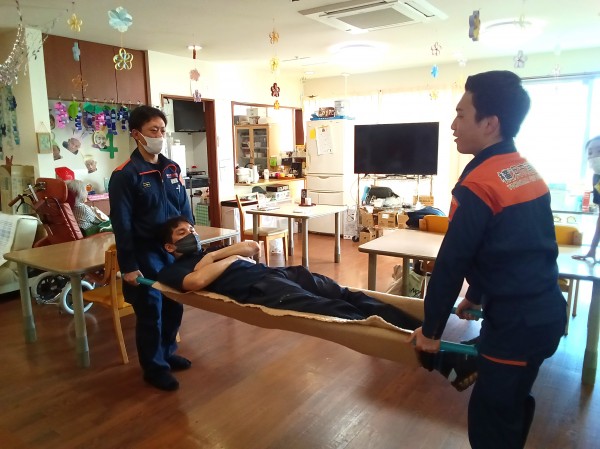アドバイスや質問、簡易担架の作り方を教えてくれました。