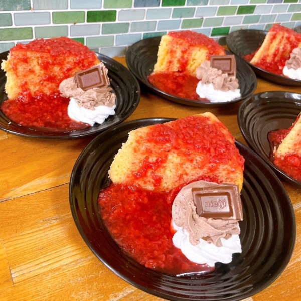 焼きあがると、ふんわりとした甘いケーキになりました。特製いちごソースと生クリームを添えてバレンタインらしい華やかなデザートに仕上げました。