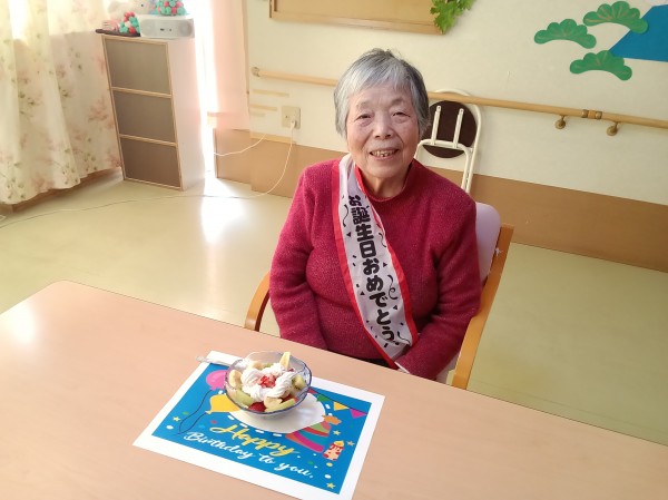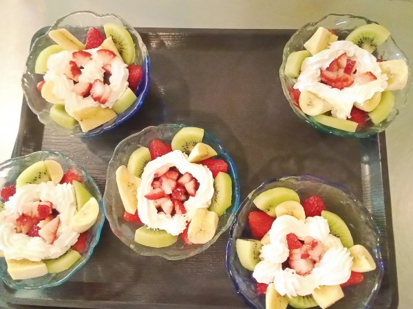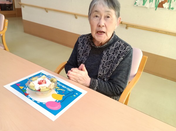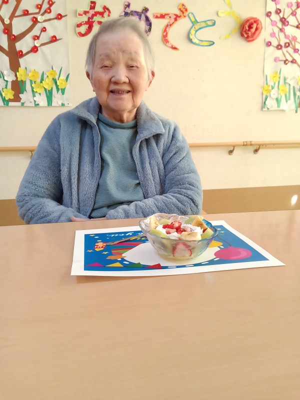 お祝いデザートは職員手作りのプリンアラモードです♪