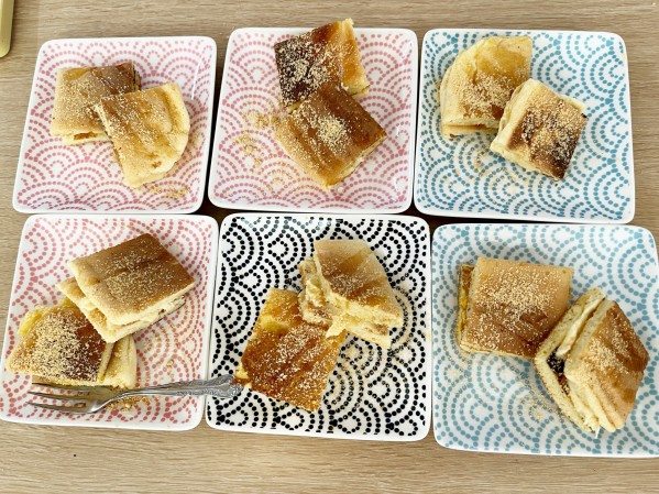 四角いフライパンは油を使わずにヘルシーな生地が焼けます!温めたフライパンに流し込み真ん中がぷつぷつとしてくるまで弱火で焼きます。フライ返しでまだかな~?と、何度も端っこを突っつくのでちょっと形がいびつに…そして何故か⁉思ったより膨らみませんでしたが…ふんわり柔らかい生地に焼きあがりました。I様に一口サイズに切り分けてもらいました。