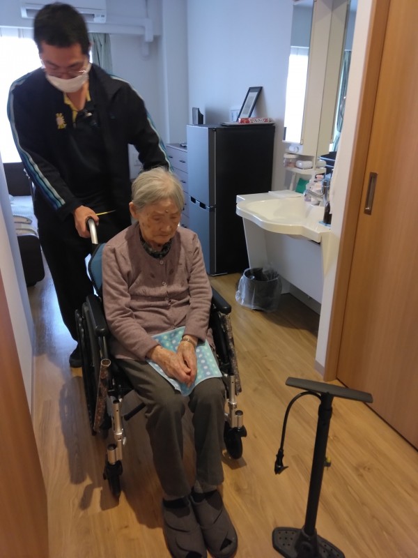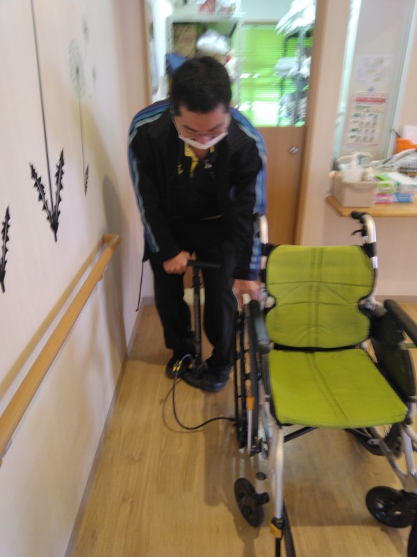 タイヤの空気圧の確認し、必要時にタイヤに空気を入れます。