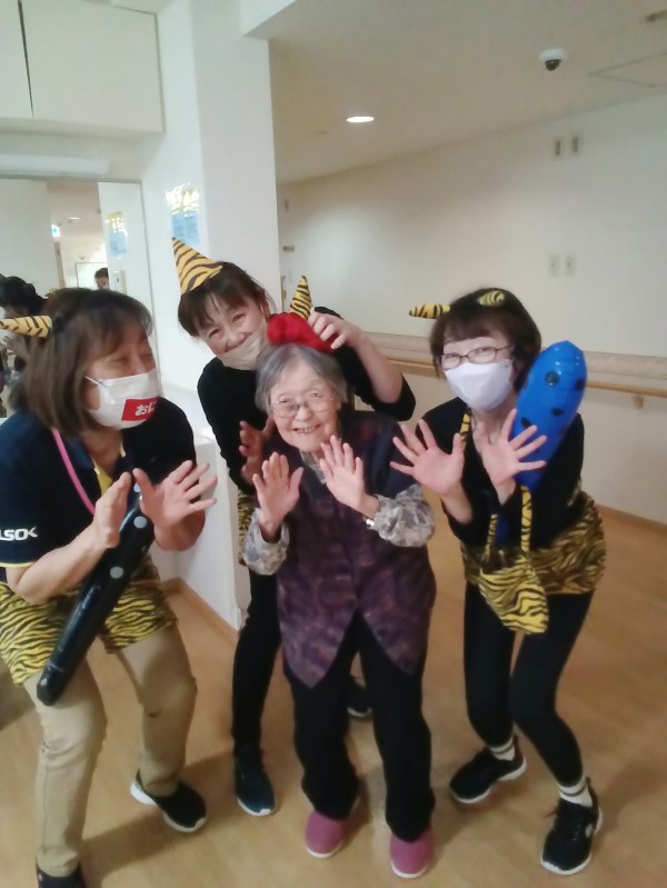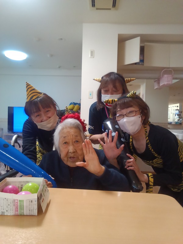 何やらコスプレ大会の様相になってまいりました(⊙o⊙) 豆まきを終え、鬼と一緒に記念撮影「ハイチーズ」(^人^)