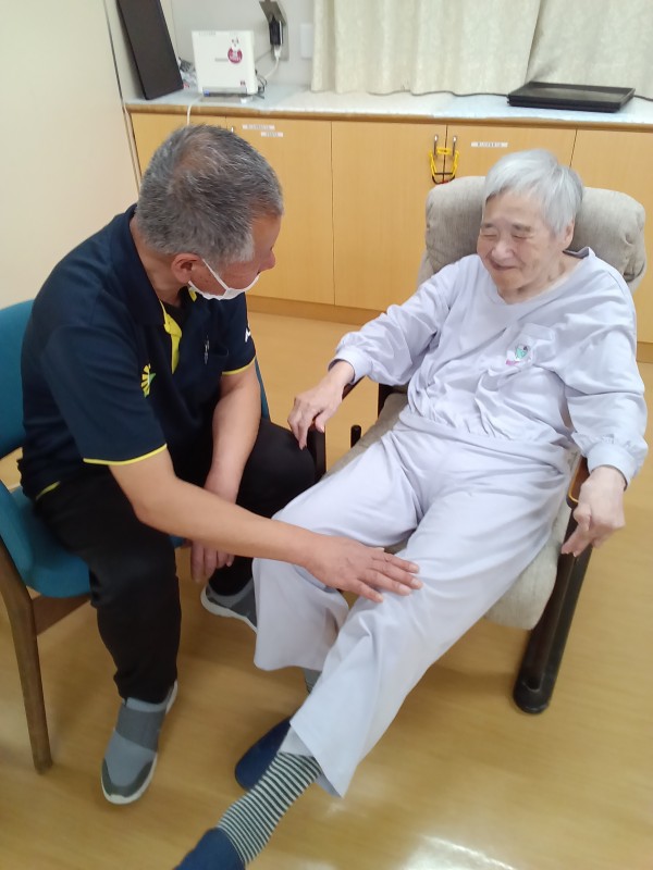 職員が「こっちの足を1,2,3,4...」と10回ずつ上げたり下げたりするためのお声がけをします。