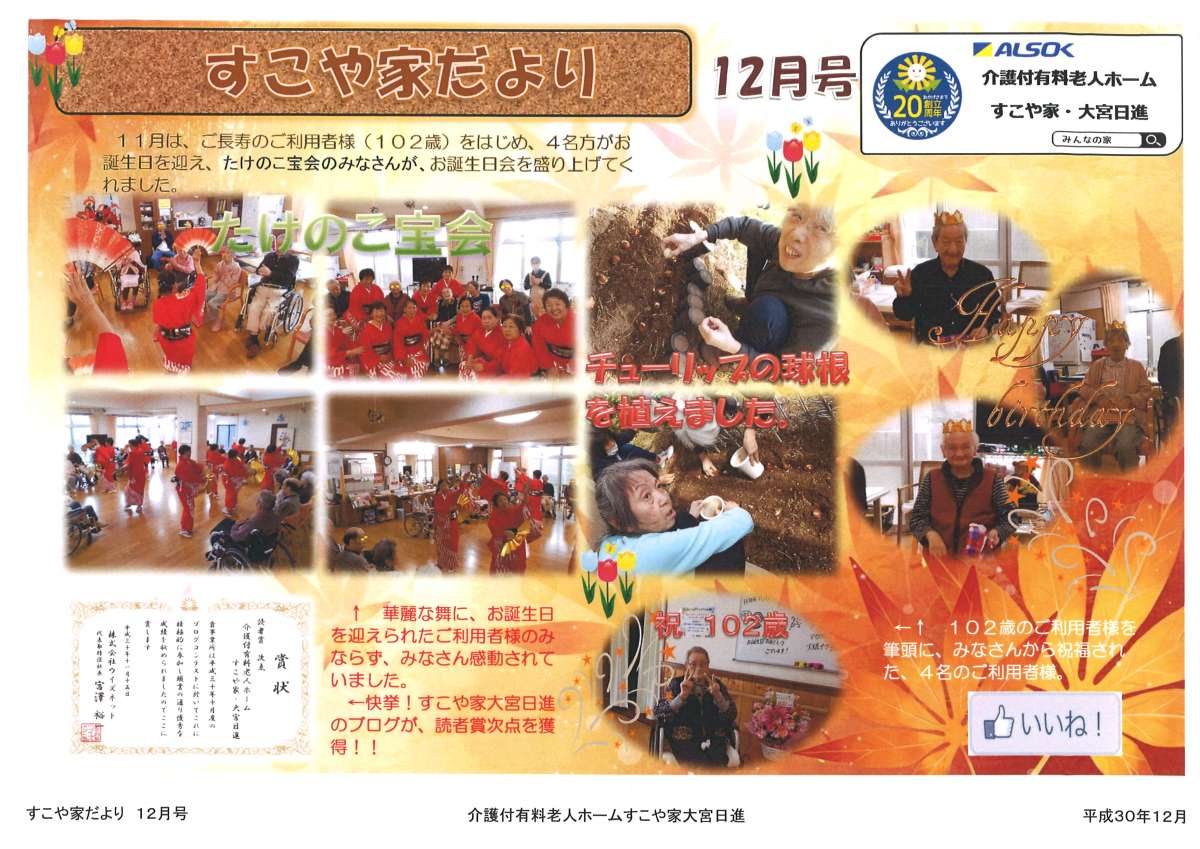 介護付有料老人ホームすこや家大宮日進の先月の様子を、ブログとは別に1枚にまとめ、近況報告としてご家族様へお伝えしています。