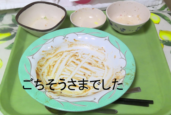 今日の献立はハヤシライス ジャーマンポテト いんげんとカニカマサラダ オレンジゼリーです。
