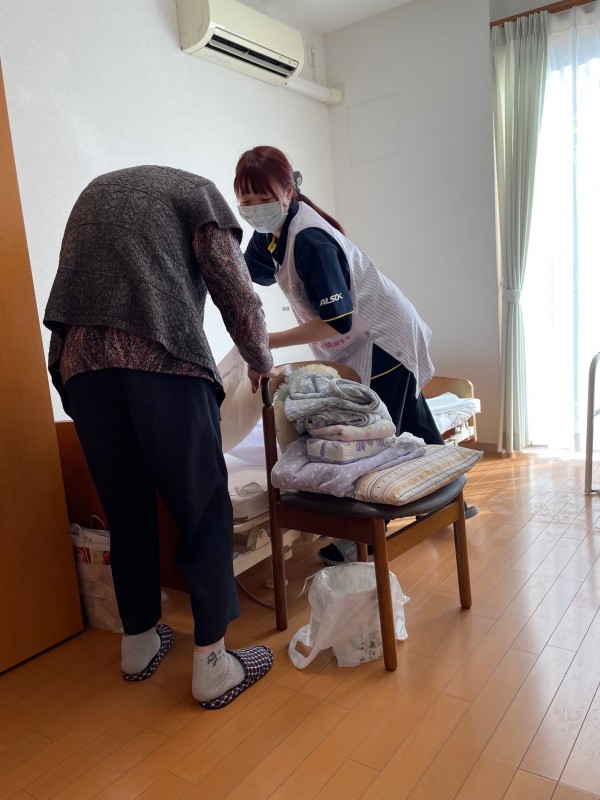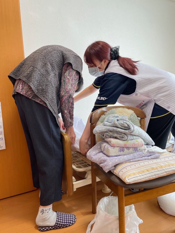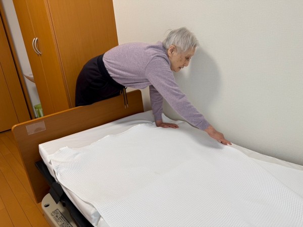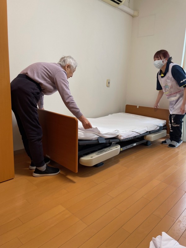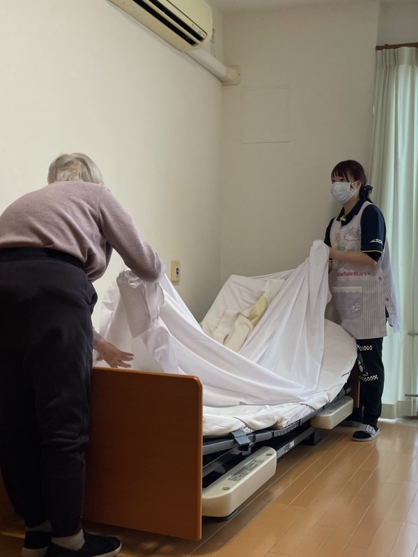 スタッフと一緒に、シーツを外したり、新しいシーツをピシッと伸ばしたり、みなさん積極的に協力してくださいました。