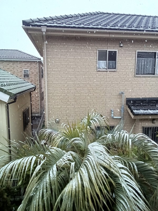 みぞれから雪に変わり、少し葉の上に積もってきましたね。