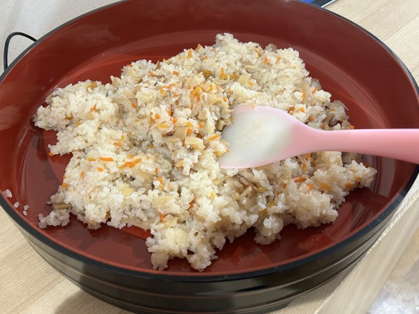 炊き込みご飯にお酢を入れ、皆様とご一緒に混ぜていきました。