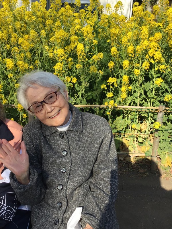 菜の花を背景に記念撮影です。