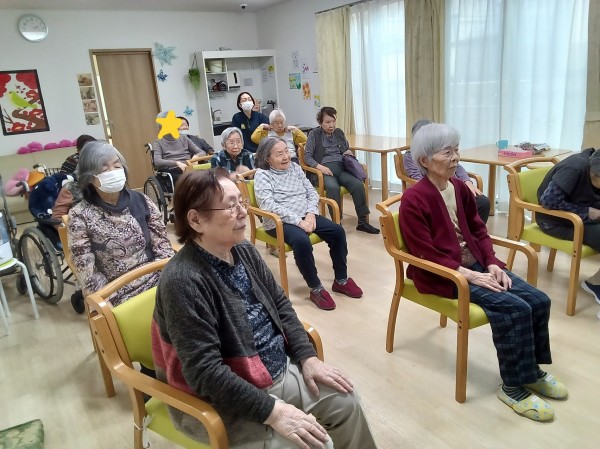 ご入居者の皆さまで1階のフロアに集まって、リモート運動教室に参加されました!