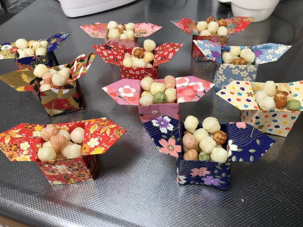 ひなあられを入れた「三方」はご利用者様にも協力していただき折り紙で制作しました!