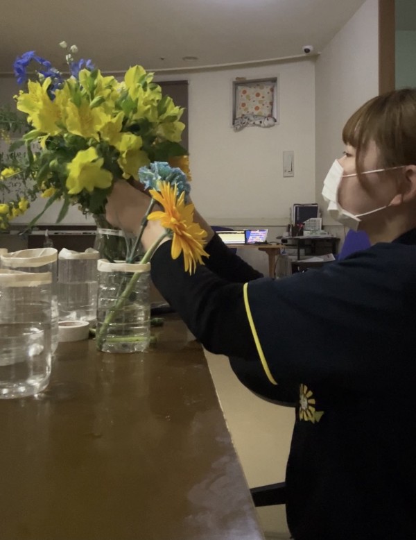 夜勤中に準備!青と黄色のお花、とっても綺麗です♪