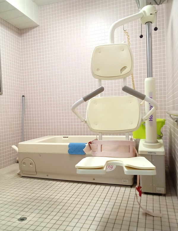 当ホームでは 1階に座ったまま浴槽へ移動することが出来る機械を設置した浴室と