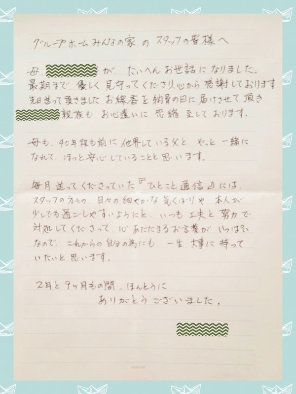 今回は、退居されたご利用者様のご家族様から感謝のお手紙を頂いたので、紹介したいと思います。