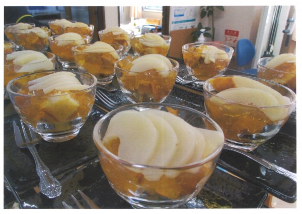 今回は一口大に刻んだフレンチトーストにピーチゼリーとホイップクリームをトッピングしました。ご利用者様にも大好評でした♪