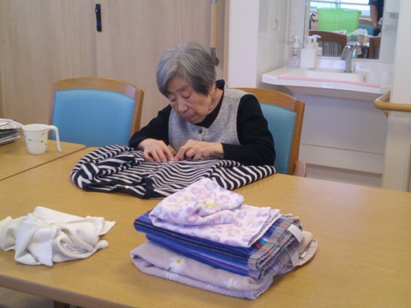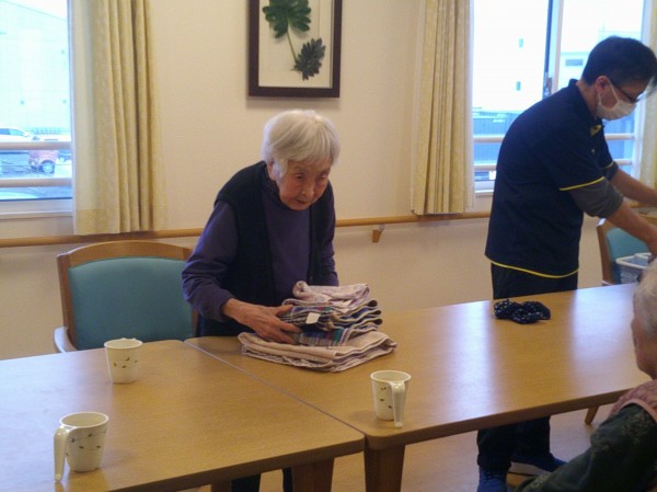 2階入居者様方に自立支援も兼ねて洗濯物たたみを行いました。