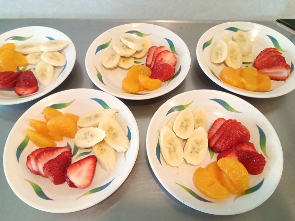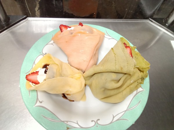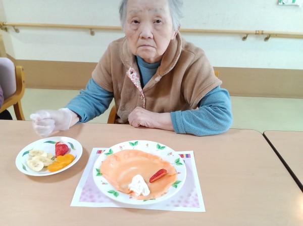 クレープ生地にフルーツとクリーム♪早く食べたいですよね!もう少しで完成ですね~