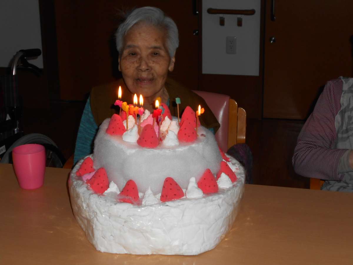 利用者様全員で歌でお祝いした後、特大ケーキのろうそく火を吹き消していただきました。