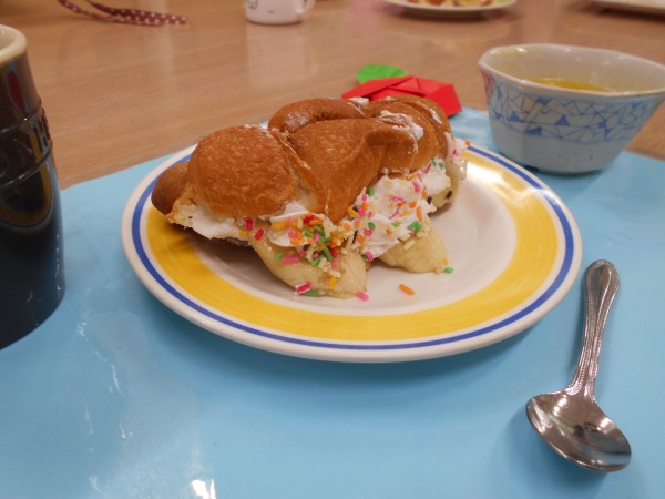 クロワッサンに生クリームとバナナをサンドし、カラフルスプレーを振りかけて完成です(^^♪