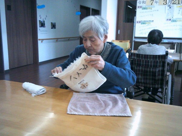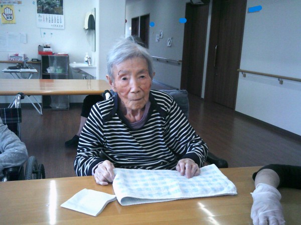 タオルを畳んだりとお手伝いされています(^0_0^) 手の運動をかねておられますね!