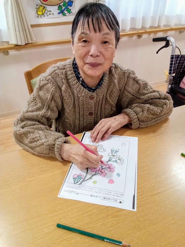 各フロアではレクの時間に時々季節のイラストのぬり絵をして楽しんでいただいております♪