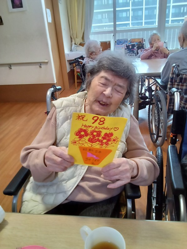 皆さんから「ハッピーバースデー」の歌を唄ってお祝いされ職員からはカードと手作りケーキを♡