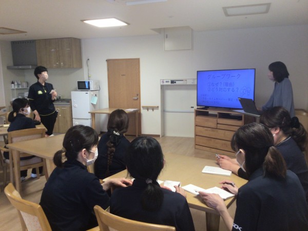 グループワークで、課題について話し合い、各々の意見を出して発表して行きます。活発な意見交換をする事で、職員同士のコミュニケーションも取れて行きます。