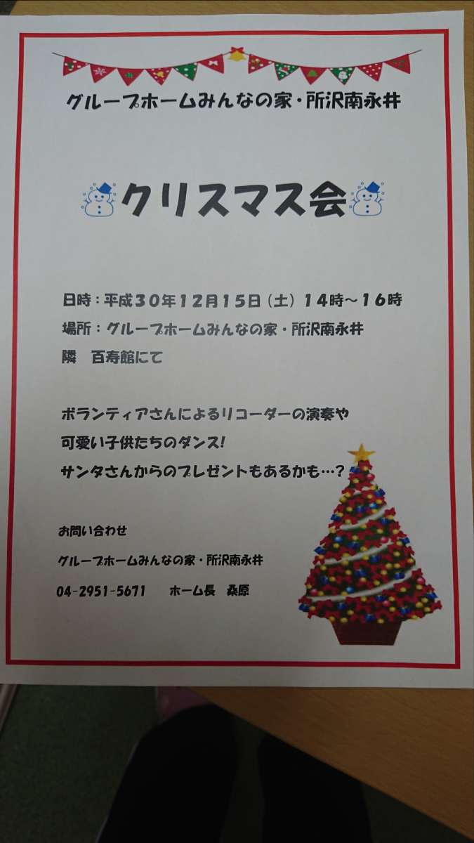 グループホームみんなの家・所沢南永井では12月15日にクリスマスを開催いたしますヽ(´▽`)/リコーダーのボランティアさんや、子供たちのダンスなどなど…楽しいことを企画しておりますので、ぜひご参加ください♪