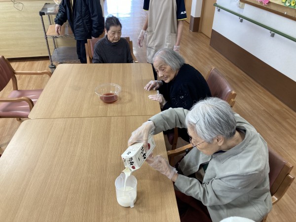 牛乳もしっかり量を測ってから投入。なかなかピッタリとはいかず、思わず「モー」とダジャレがこぼれます。しかし良かれと思ったこのダジャレ、